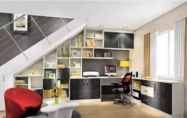 利用楼梯下面空间,打造开放式书房。合理利用空间,提升了整体空间使用性。黑白的经典搭配,时尚潮流配上其他色彩来点缀,冲击你眼球。