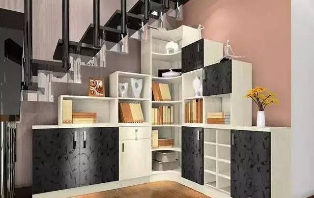 利用楼梯下方空间设置成一个储物的空间,是储藏书籍、过季的衣服或者杂物的一个好地方,巧妙的利用了每一寸宝贵空间,是一个最佳的储物空间。