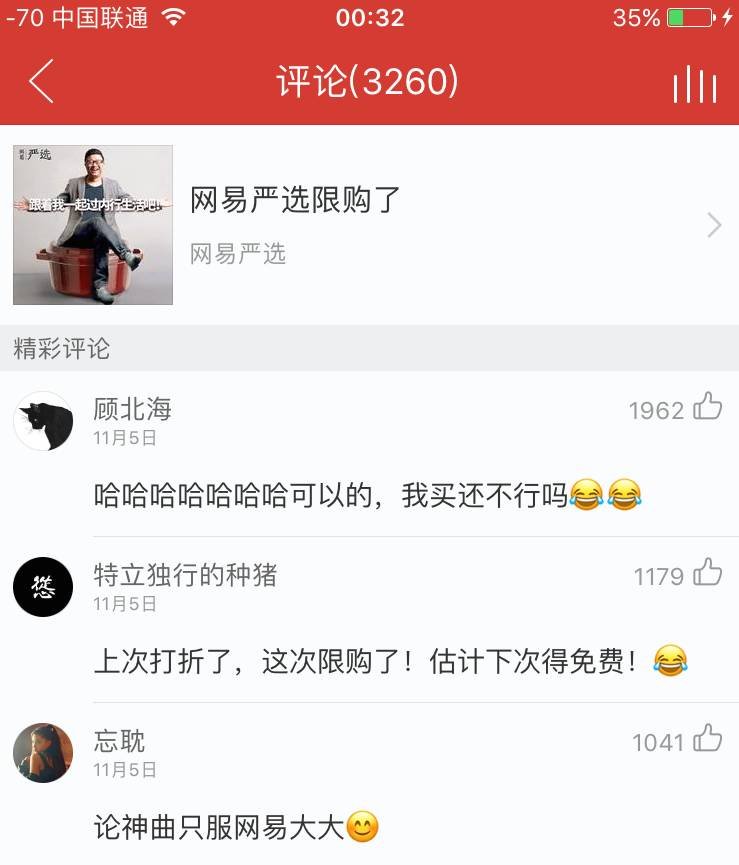 网易严选则在云音乐上发布了又一首魔性神曲《网易严选限购了》,吐槽双十一买了后悔,推广网易严选限购3件的活动。
