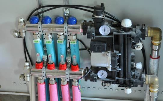 分集水器:包括分集水干管、排气泄水装置、支路阀门和连接配件等。它的作用相当于地暖系统的心脏,整个地暖系统的热水靠分集水器把它均匀的分配到每个支路,经地暖管内循环后汇集到一起,在水泵水力的作用下进行二次分配,以此来保证整个采暖系统的安全正常运行。