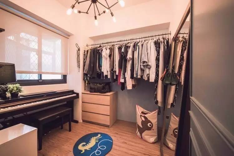 空间用不完,所以还兼做了琴房,没事儿弹弹琴,培养一下艺术情操。角落里的置物架、墙上的衣帽钩、地上的收纳柜,放一些小东西,特别方便!